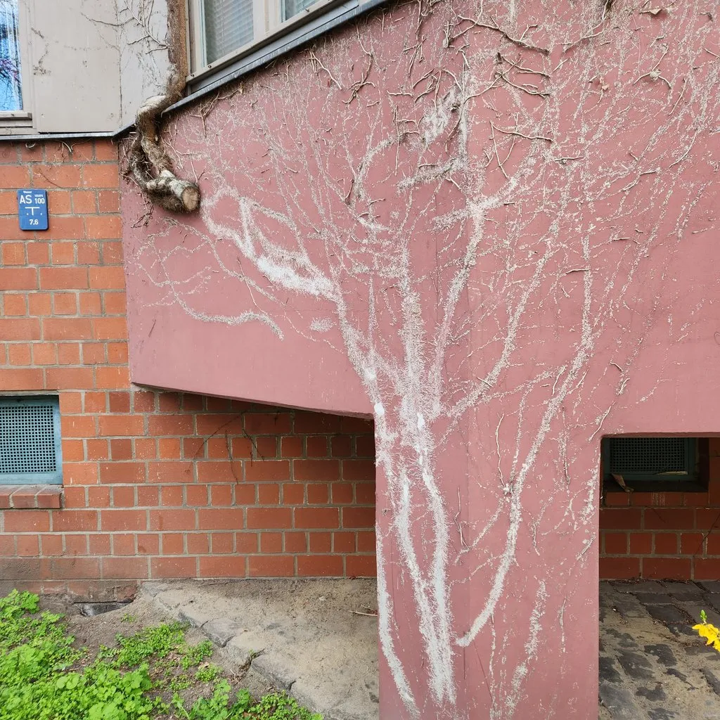 벽에 붙어있던 나무가 강제로 제거되고 하얀 흔적과 말단부위만 남아 있는 모습이 눈길을 끈다.