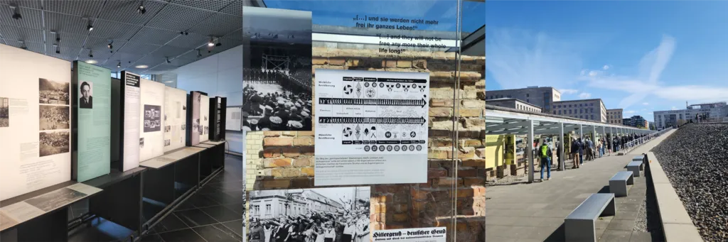 Topography of Terror에 갔다. 외부에는 장벽의 일부와 전시가 있고 건물 내부에 본전시가 있다. 입장료와 전시 오디오 가이드가 무료이다. 무료 와이파이를 연결하면 오디오 가이드가 있는 웹사이트로 연결되는 편한 시스템이다. 전시는 나치 리더들의 만행과 초라한 말로, 나치 독일이 주변국에 미친 영향 등 폭 넓은 주제를 다루고 있다.