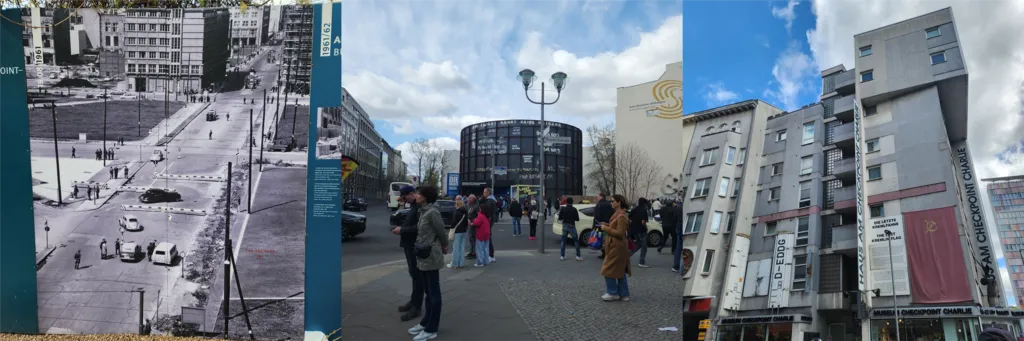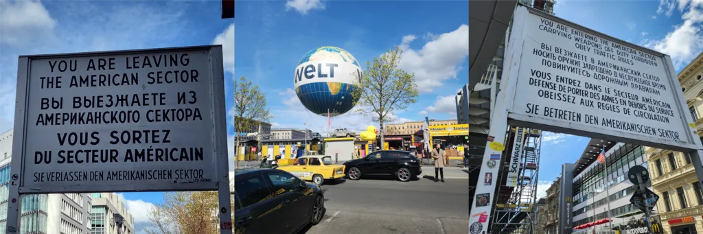걸어서 근처에 있는 Checkpoint Charlie에 갔다. 동독이랑 서독을 나누던 곳에 있던 표지판의 앞뒷면인데 독일을 분할했던 나라들에 따라 영어, 러시아어, 프랑스어, 독일어 네 가지 언어로 쓰여 있었다. 체크포인트 A, B, C 등이 있는데 C의 NATO 음성기호가 Chalie라서 체크포인트 찰리가 되었다.