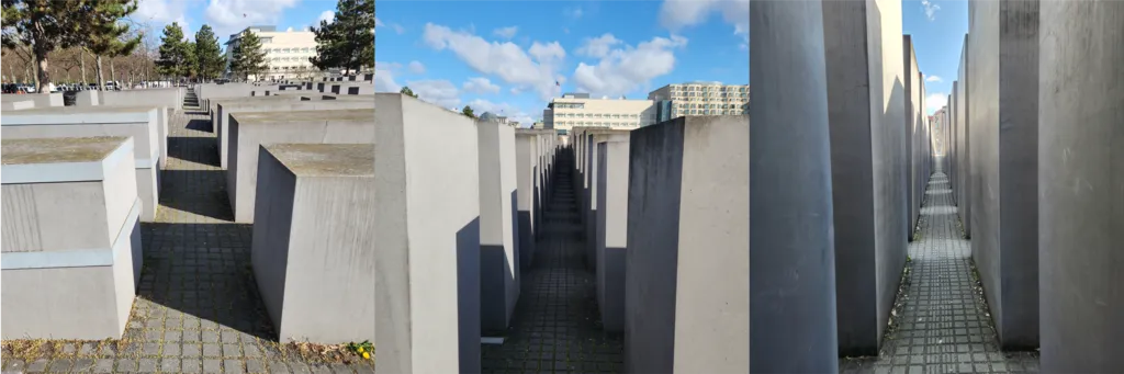 조형물 안쪽으로 들어가서 걷다 보면 왼쪽 사진에서 오른쪽 사진으로처럼 딱히 의식하지 못한 새에 점차 바닥이 꺼져서 콘크리트 육면체들 사이 파묻힌 스스로를 발견하게 된다. 들어가기 전 밖에서 볼 때는 예상하기 어려운 시야다.