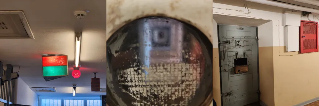 - 독방에 있는 수감자들이 서로를 확인하는 것은 금지되어 있었다. 가족들이 같이 수감되어 있는 경우가 있었음에도, 자신 이외에 누가 있는지 절대 알 수 없었다. 저 신호등도 그걸 위한 도구다. 수감자가 복도에 나와야 할 때는 빨간 불을 켜 건물 전체에 알려서 같은 시간에 다른 수감자가 복도에 나오지 않도록 하는 것이다.