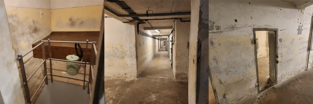 - 다양한 감옥 방들 중 하나다. 저 나무판은 침대이다. 저 좁은 방에 여러 명의 사람들을 수용하고 변기 하나만 두었다. 사진은 없지만 어떤 방은 천장, 바닥, 벽이 전부 푹신한 재질로 되어 있었고 전부 까맣고 어두웠다. 방음과 자해 방지를 위한 것이었다고.