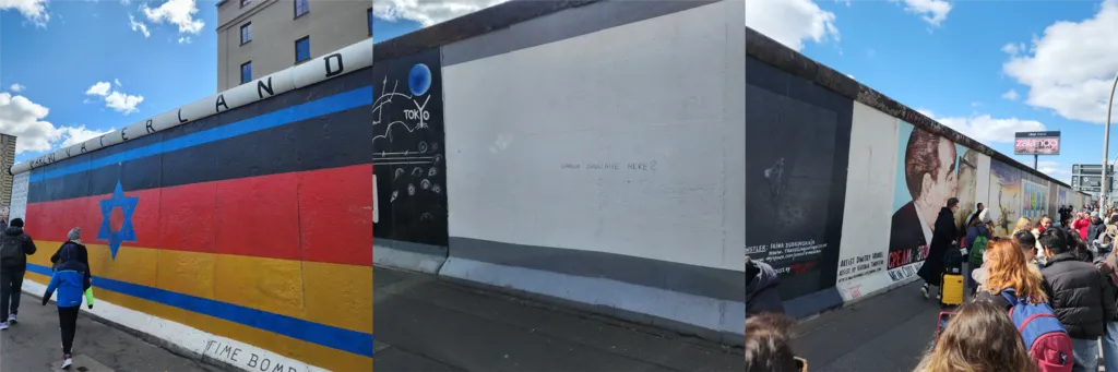 조금 더 걸으면 East Side Gallery가 나온다. 1989년 베를린 장벽이 무너진 직후 여러 나라의 예술가들이 당시의 정치적 상황에 대한 그림을 그리기 시작했다고 한다. 브레즈네프와 호네커가 Bruderkuss를 하는 벽화 ‘Mein Gott, Hilf Mir, Diese Tödliche Liebe Zu Liberleben (신이시여, 도와주세요, 이 치명적인 사랑에서 살아남도록)’ 앞에는 역시나 사진을 찍으려는 관광객들이 넘쳐난다.