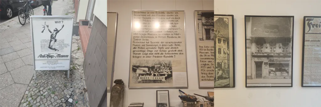 이 날의 마지막 목적지는 반전박물관이다. 입장료는 무료이다. 여기는 1925년에 Ernst Friedrich가 세웠는데, 그 이후 수 차례의 파괴와 다른지역에 재설립되는 것을 반복했다. Ernst Friedrich가 죽고 15년 후에 그의 손자가 현재의 위치에 재설립했다.