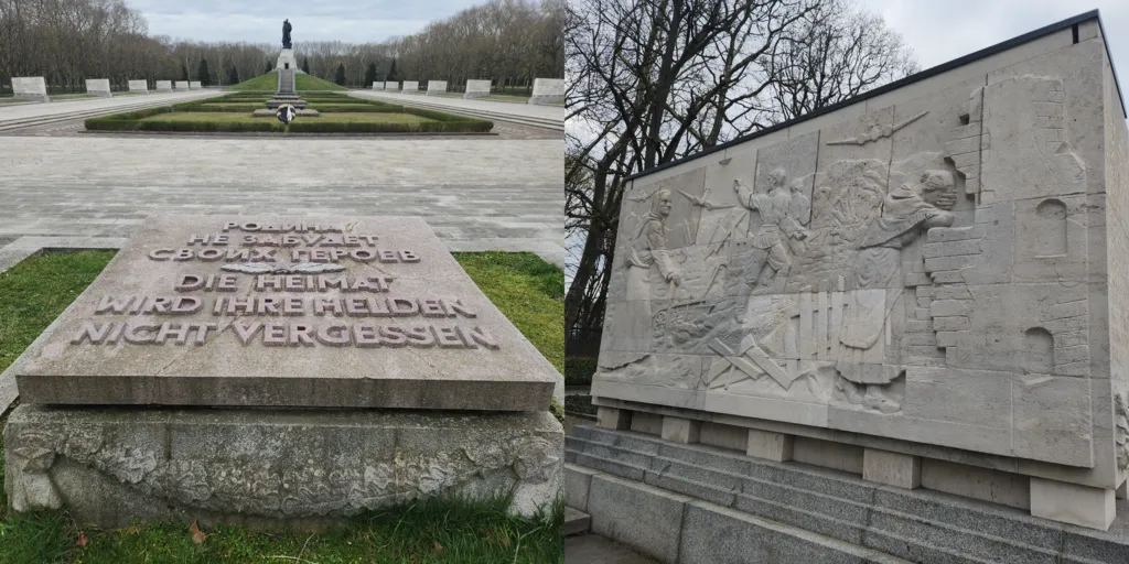 Treptow 공원에 위치해 있다. 공원의 길은 흙바닥이고 운치있는 호수가 있고 새와 다람쥐도 많았다. 동네 주민들이 조깅을 하고 있었다. 이 메모리얼은 나치 독일군을 항복시킨 독일-소련 전쟁과 거기서 전사한 소련 군인들을 기념하는 곳이다. 2차 세계대전 종전 후 소련 건축가가 설계했다. 1990년에 독일 통일 허용 협정의 일환으로 독일이 독일 내 전쟁기념비의 유지보수에 책임을 지기로 했다고 한다. 그리고 그후로도 유럽 승전기념일에 행사를 여기서 한다고.