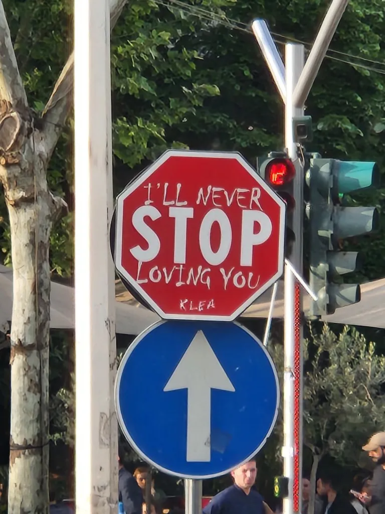 티라나에 있는 STOP표지판의 대부분에 ‘I’ll Never’—STOP—‘Loving you’ 가 쓰여 있어서 처음에는 프린트인 줄 착각한다.