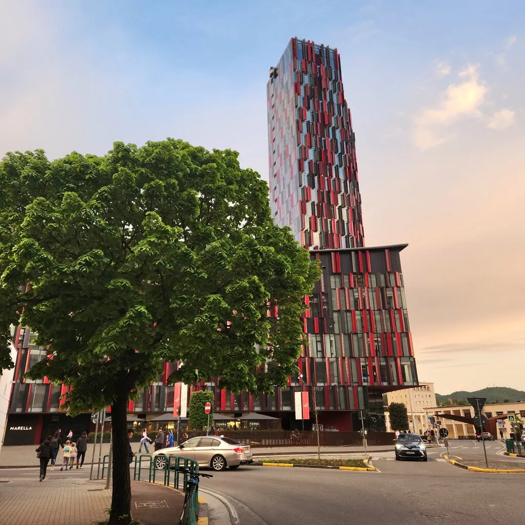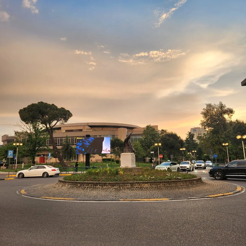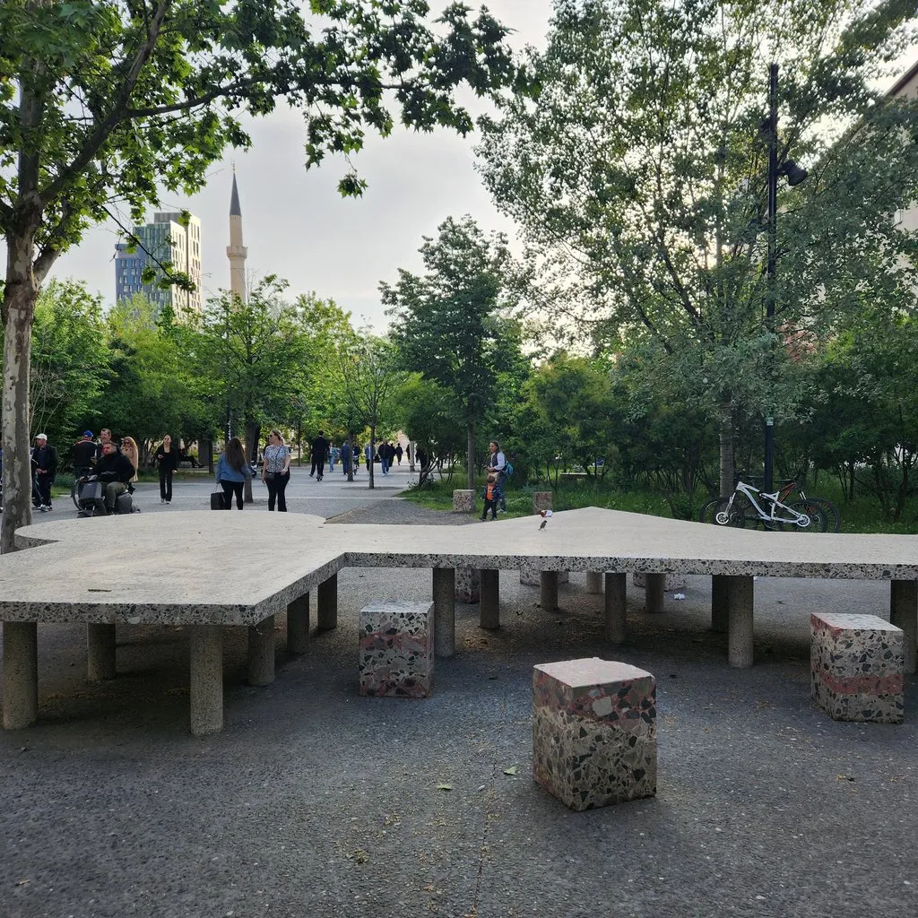 버스에서 내려서 걷는 몇 분 동안 이 도시에 대한 첫인상이 형성된다. 그 가운데에는 푸릇푸릇한 활엽수들, 도시 전체에 은은하게 깔린 향기를 내뿜는 꽃들, 붉은기가 도는 돌로 만들어진 이상한 형태의 공공 조형물들이 있다. 붉은색 돌로 된 무언가들은 티라나의 곳곳에 옹기종기 앉아 존재감을 드러낸다.