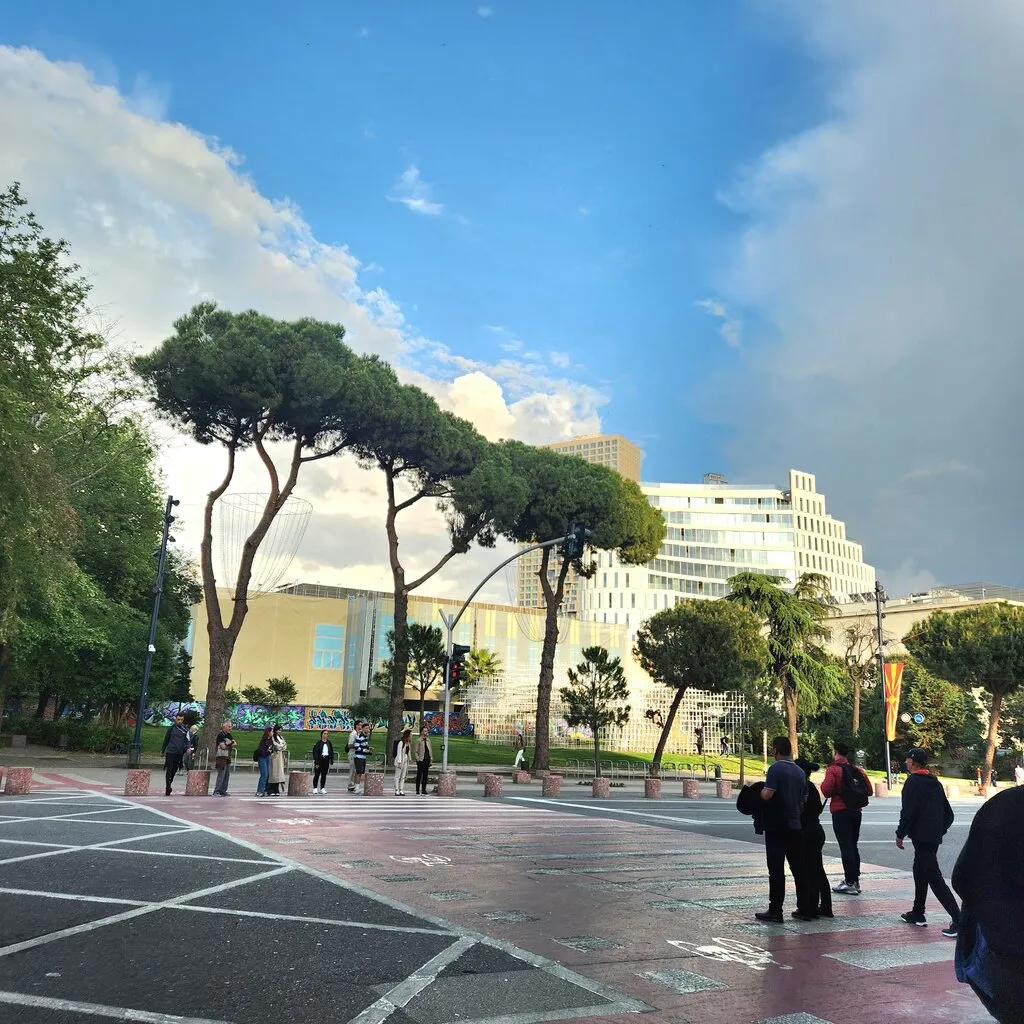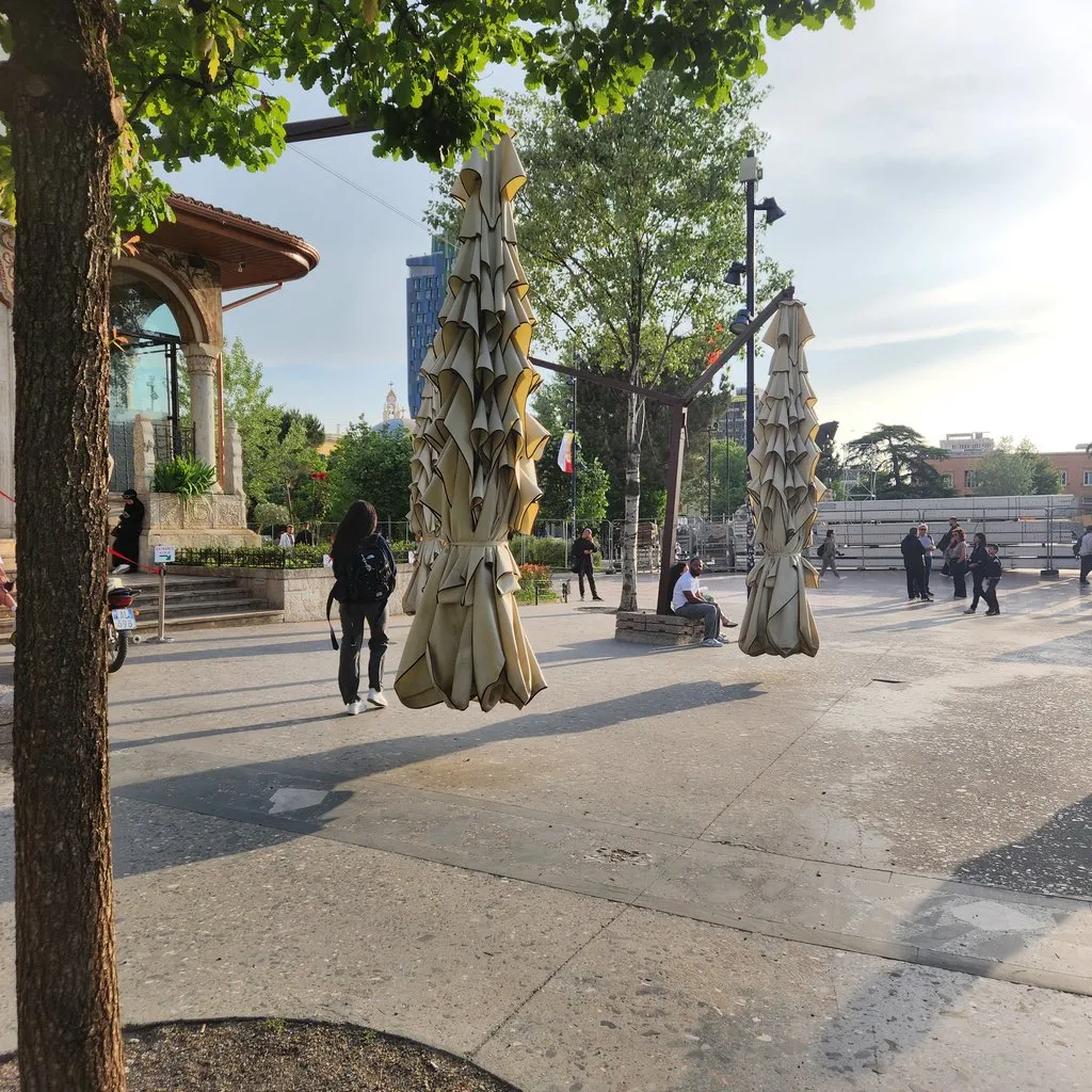 좀 더 걷다 보니 도너 케밥의 고기처럼 매달려 있는 접힌 파라솔과 모스크, 스칸데르베그 광장이 있다. 광장의 이름은 오스만 제국에 대항해 반란을 이끌었던 알바니아 군사령관 스칸데르베그의 이름을 딴 것이다.