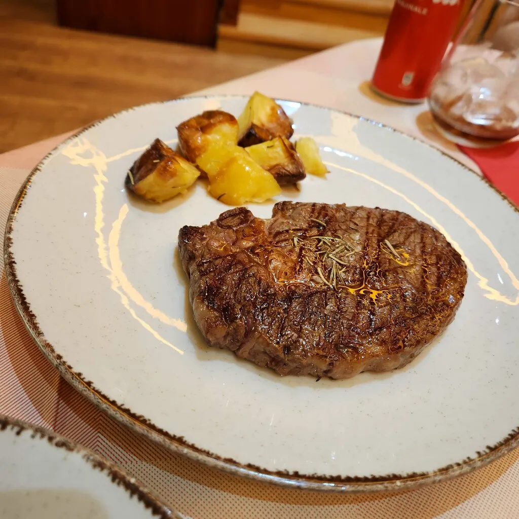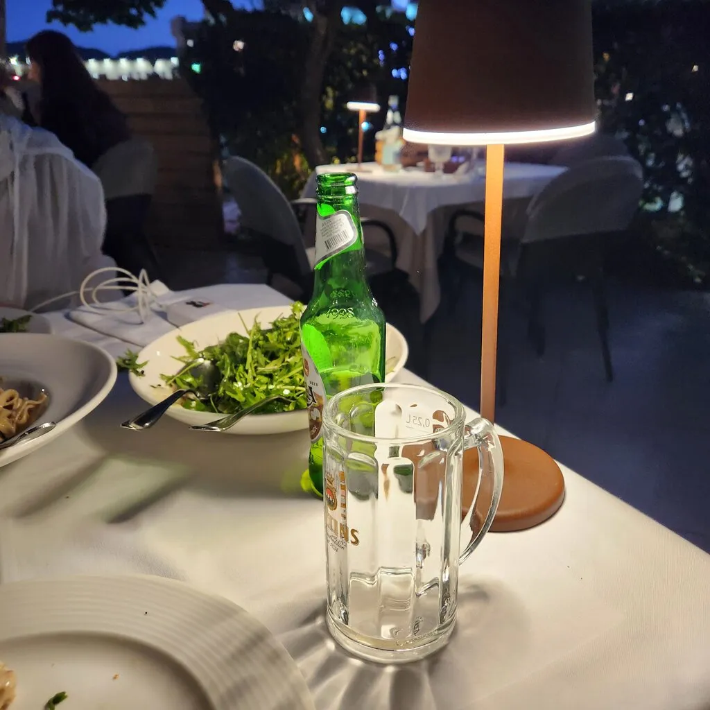 배가 안 꺼져서 스테이크 한 점과 음료만 시킨다. 나는 목이 말라 맥주 500ml를 시켜서 꿀꺽꿀꺽 마신다. 고기는 몇 점만 떼어 먹는다. 미디움 레어여서 육회 느낌이다. 칼 모양이 신기하다.