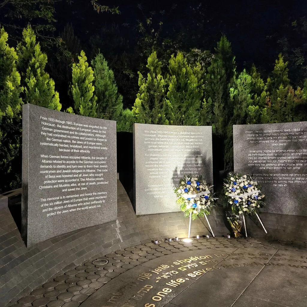 이 기념비는 유럽의 살해당한 6백만 명의 유대인과, 세상이 그러지 않을 때 사심 없이 유대인들을 보호하기 위해 행동했던 알바니아 시민들을 위한 것이다.