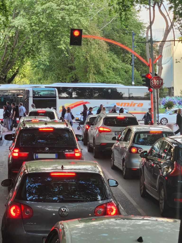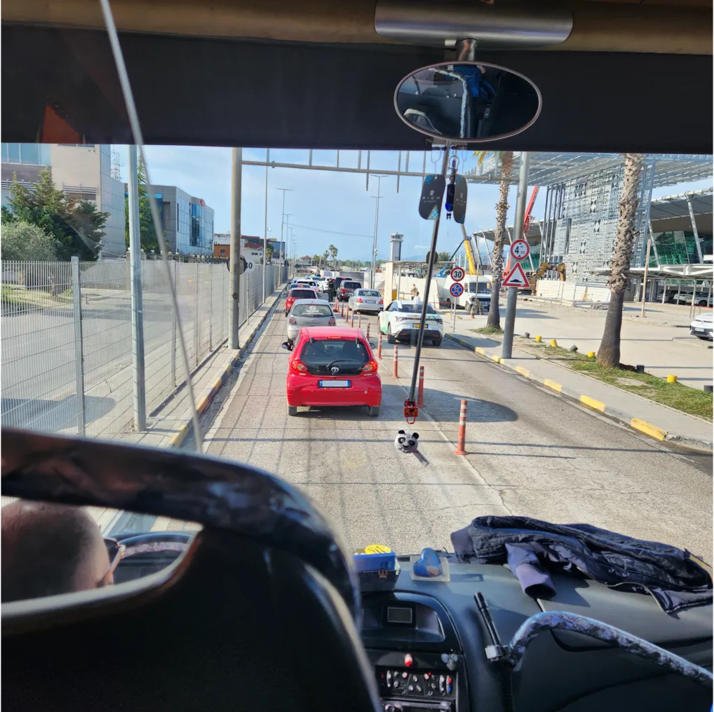 우리가 전적으로 의존하고 있는 구글 맵에 까맣게 표시된 LUNA 버스 노선에 몸을 싣는 것이 다음 퀘스트다. 버스를 찾아 공항을 나온다. LUNA 버스는 로고가 눈에 잘 띄는 곳에 있고 행선지도 적혀 있기 때문에 이 나라에서 이후에 타게 될 버스들보다 비교적 찾기 쉽다. LUNA는 공항과 티라나 중심을 잇는, 한 시간마다 다니는 버스다. 우리는 아직 버스비를 어떻게 내는지도 모른다. 일단 버스에 앉아 있으면 나중에 돌아다니면서 승객들에게 400유로씩 현금으로 걷는다는 것을 알게 된다.