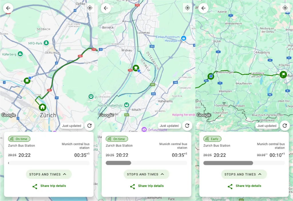 플릭스버스를 알바니아 때도 타봤지만 제대로 로고가 박히고 버스 모양을 한 걸 타보는건 처음이었고 앱에 이렇게 위치가 뜨는 것도 처음이었는데, 경로를 이탈하기 시작했다. 분명 Munich가 버스에 찍혀 있는 걸 보고 탔으니 맞을거라고 믿으며 기다렸다. 스위스와 독일을 분리하는 호수를 왼쪽으로 도는 것이 원래 경로였는데 오른쪽으로 돌아서 오스트리아까지 거쳐서 갔다. 여권 검사는 맨 처음 버스에 탈 때 한 번밖에 안 했다.