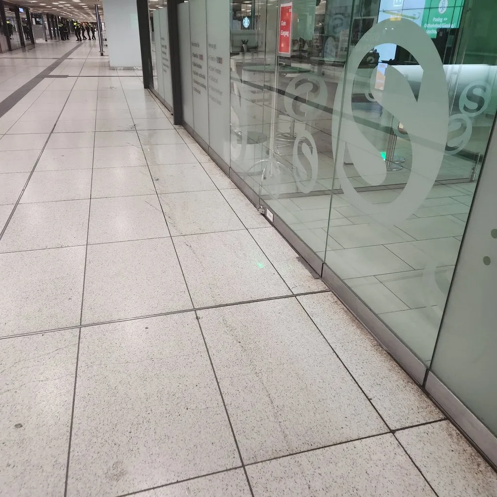 일단 닦기만 하면 된 거다! 라고 주장하는 듯한 바닥의 청소차가 지나간 구정물과 남발된 S반 로고