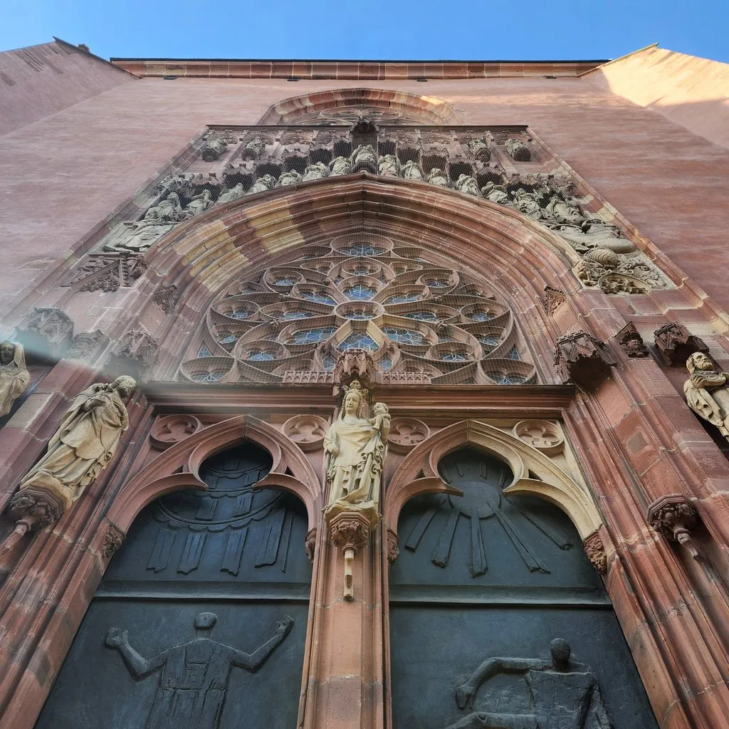 아이콘인 검은 문 위의 양각과 구체적으로 묘사된 조각상들과 추상적인 장식. 3종의 그래픽이 한곳에