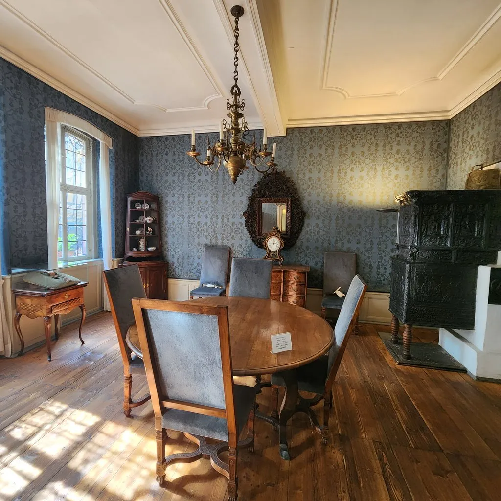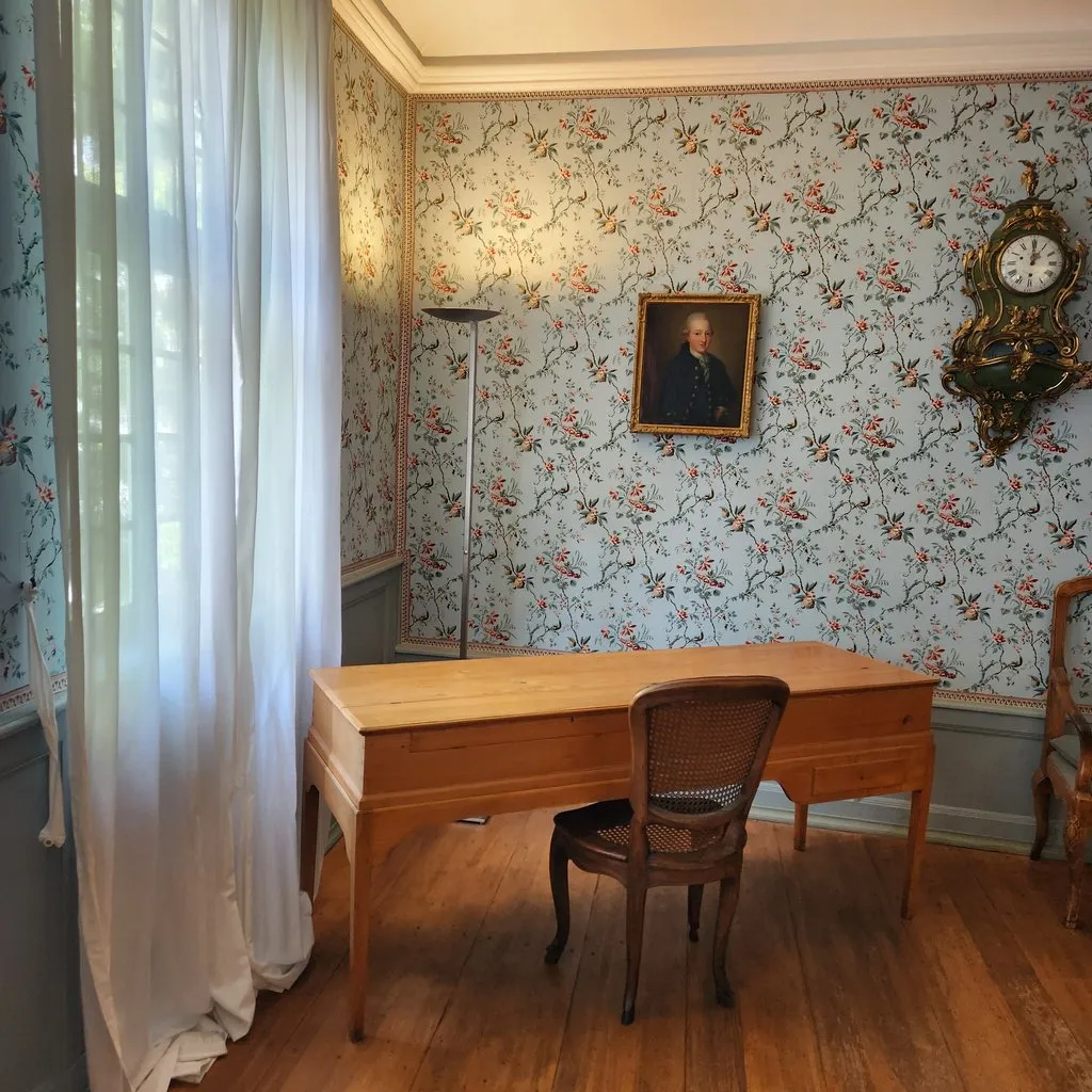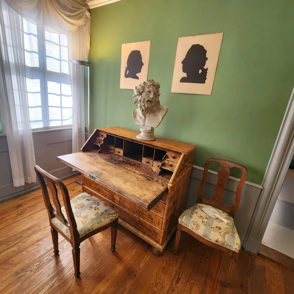 괴테집에는 정원이 있고 요리사, 하인도 여러명 있다. 4층짜리에 다락방도 있다. 한 층에 방이 네다섯개쯤 있다. 여긴 푸른방이다. 이때 이런 색깔 벽지가 유행했다고 한다.
