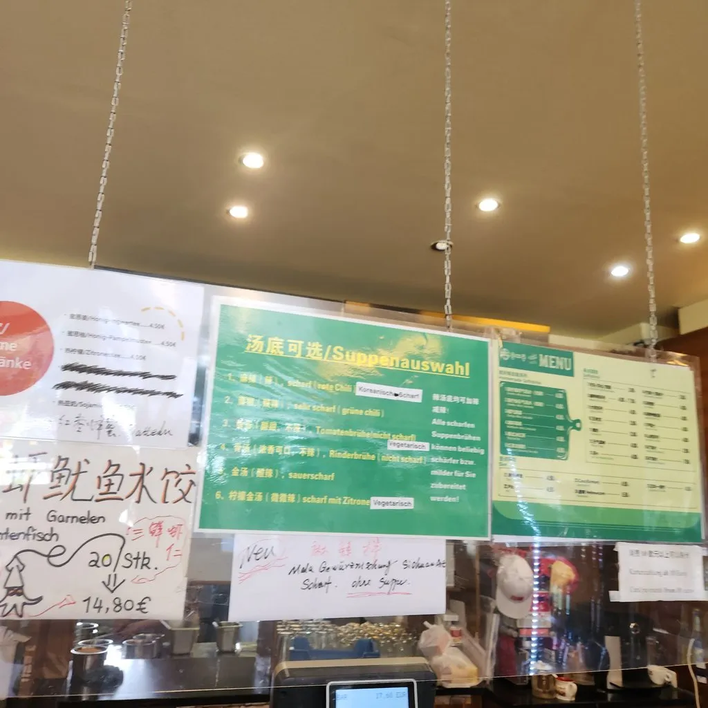 수프를 선택해야하는데 1번 ‘빨간고추’, ‘매움’은 ‘한국 매움’이라고 쓰여있다. 한국식 마라탕 맛인듯. 2번은 ‘초록고추’는 그냥 매움도 아니고 ‘Sehr 매움’이라고 돼있어서 얘가 진짠가? 라는 생각에 그걸로 했다.