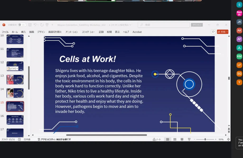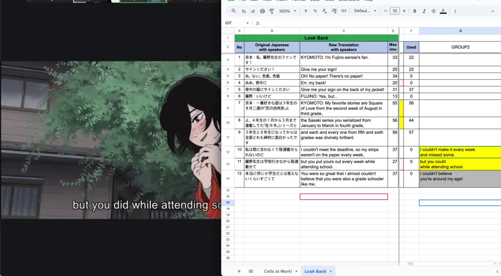 그리고 실습 안내가 시작됐다. 참여자들에게 두 작품, ‘일하는 세포’ 실사판과 ‘룩백’의 클립을 보여주고 영어 직역 문장들을 제시한다. 그러면 참여자들은 그 문장들을 수정해서 최종 자막을 만들어야 한다. 영어 문장을 고치는 거기 때문에 일본어 지식이 없어도 참여 가능했다.