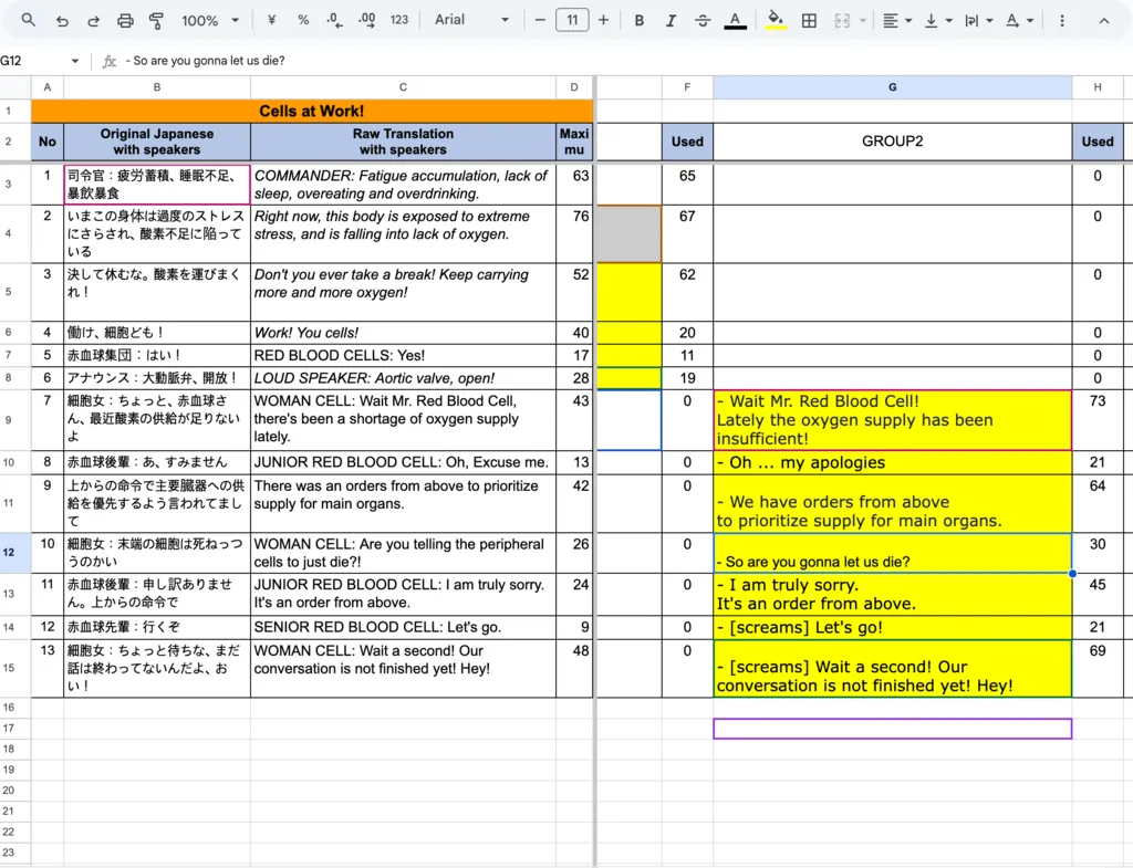 첫 번째 클립에서 나는 'Are you telling the peripheral cells to just die?!'라는 문장을 So are you gonna let us die? 로 바꿨는데, 난리통인 작중 상황에서 peripheral cells라는 긴 단어를 말할 것 같지 않아서 ‘우리’라는 1인칭으로 바꿔버렸다. 피드백 때 really good하고 역할에 fit한 자막이라고 칭찬 받았다.