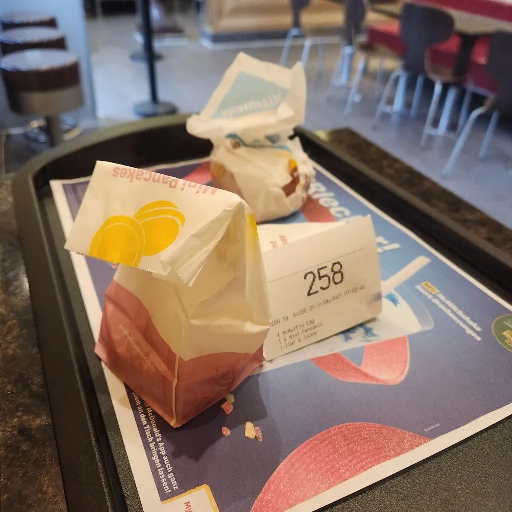 40분쯤 뜬 시간을 때우기 위해, 마지막으로 프랑크푸르트의 분위기를 느끼기 위해 프랑크푸르트 중앙역 맥도날드에서 좀 앉아 있었다. 맥머핀과 팬케이크 6개를 시켰는데 가격이 쌀 때 알았어야 했는데 둘 다 귀여운 사이즈였다.