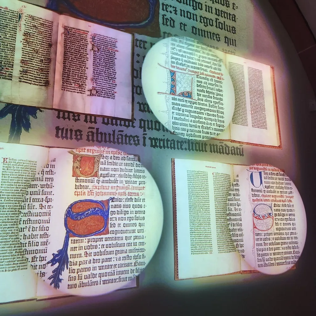 2층에 구텐베르크 관련 전시실이 크진 않지만 있다. 기존 필사본의 여러가지 색깔 넣고, 페이지 쪽수랑 제목페이지 넣고 더 화려한 것과 다른 구텐베르크 성경의 특징을 보여준다. 검정 빨강 파랑으로 한정하고 장식도 좀더간결하게 해서 텍스트가 더 눈에 들어오게 하고, 쪽수와 제목페이지가 없다. 판형은 같다.