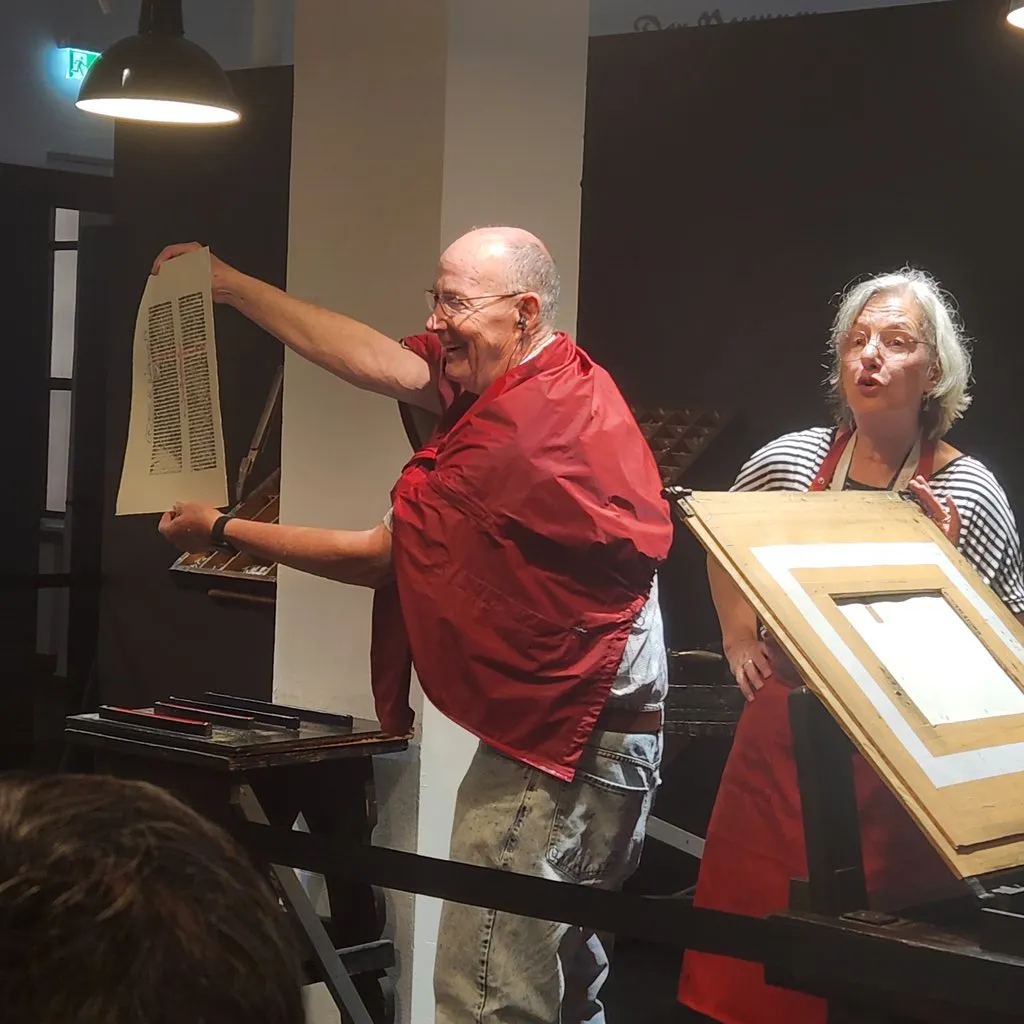 그리고 구텐베르크 활자로 직접 종이에 인쇄하는 시연이 있었다. 나는 일찍왔는데 밖에 있는 직원분께 들어가서 봐도 되냐고 하니까 좀이따 시연 다시 하니까 그때 풀로 보라고 해서 다음 시간인 일본 단체관광객들과 함께 들었다. 시연하시는 분의 아버지가 전통적인 인쇄공이었다고 한다. 디지털 프린터로 바뀌는 모습을 보면서 불평하곤 하셨었다고 한다. 거푸짐에 쇳물을 부어서 금속활자를 순식간에 만들고, 청중에게 돌리면서 보여줬다. 활자를 세팅하는 판 역시 청중에게 돌아갔다. 청중들이 오모이 오모이!를 외쳤다.