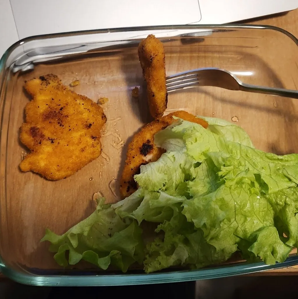 후라이팬에 해바라기 기름(Sonnenblumen Öl)을 두르고 슈니첼을 넣어 노릇노릇하게 지졌다. 이걸 해서 먹고 나면 기름 냄새가 옷과 머리에 뱄다.