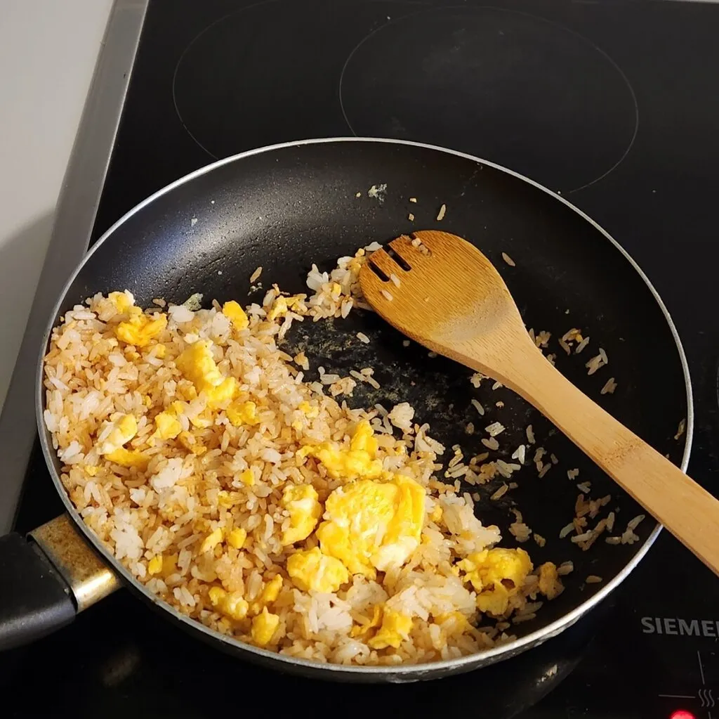 처음으로 밥솥으로 지은 밥으로 요리를 했다. 후라이팬에 기름을 두르고, 계란 두개 넣고, 밥을 넣고, 진간장을 넣고 섞었다. 3월 25일의 간장계란밥과 비교하면 엄청난 발전이 아니라고 할 수 없다.