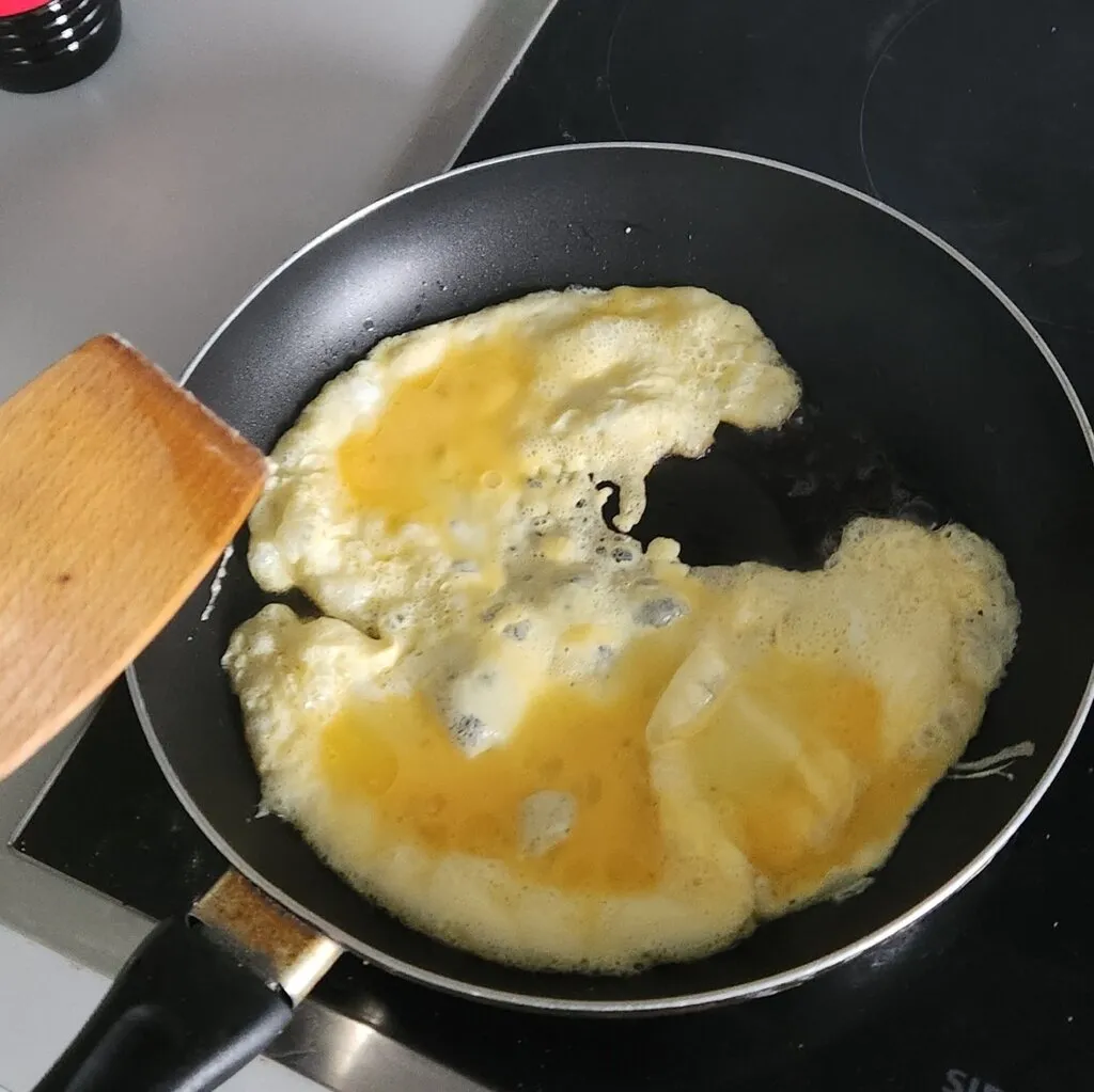 기름을 넣고 바로 계란을 깨는 것이 아니라 팬이 충분히 뜨거워진 다음에 넣어야 팬에 계란이 엉겨붙지 않는다는 것을 발견하고, 처음보는 예쁜 계란의 모습에 감명받아 사진으로 남겼다.