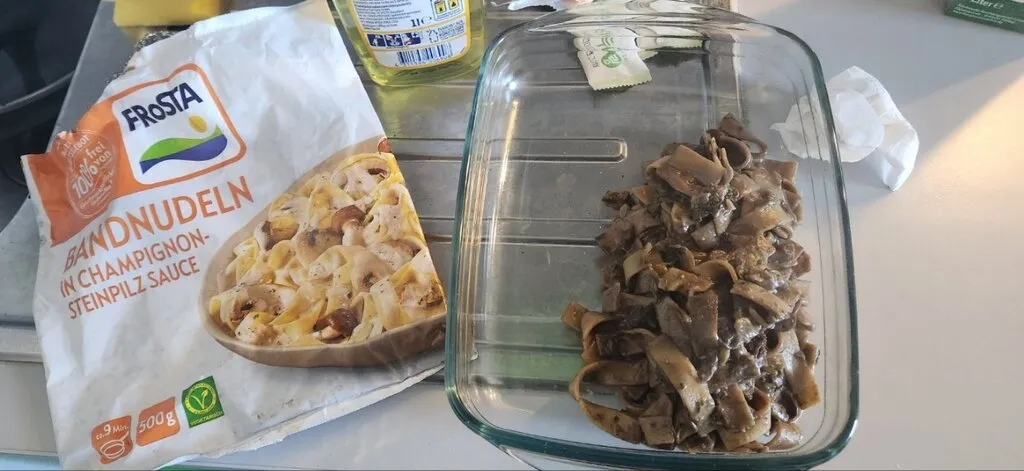 역시나 냉동식품으로 후라이팬에 내용물을 넣고 달구기만 한 것이다. 그렇다, 딱 봐도 뭔가 잘못됐다는 것을 알 수 있다. 뭐가 잘못된 건지는 모르겠다. 어쩌면 잘못된 것이 아닐 수도 있다. 맛은 괜찮았기 때문이다. 혹시 포장지가 거짓말을 하는 거고 원래 이런 색깔이 되나 리뷰를 찾아봤다. 이상하게도 대부분의 리뷰가 입을 모아 버섯에서 화학적인 냄새가 난다며 혹평하고 있었다. 다시는 FroSTA 제품을 사지 않겠다는 극단적인 리뷰도 기억난다. 하지만 색깔에 대한 언급은 찾아볼 수 없었다. 어쩌면 냉동식품인데 내가 냉장고에 며칠동안 보관해서 그런 걸지도 모른다.