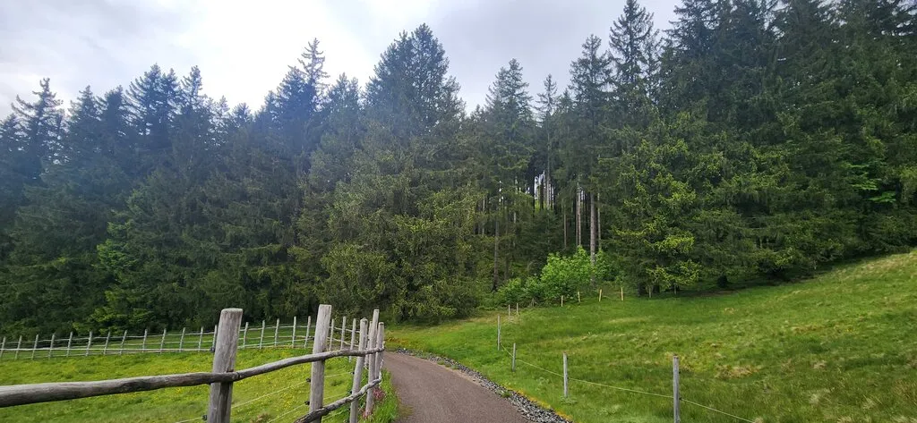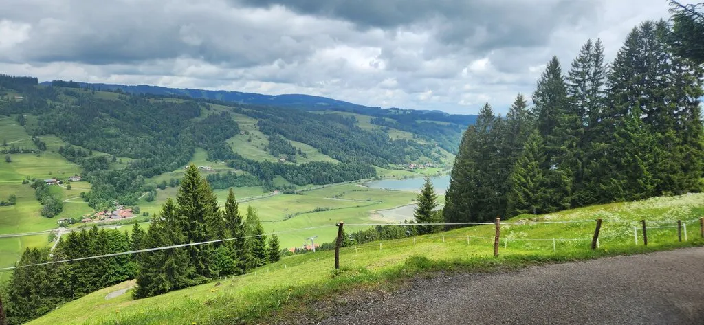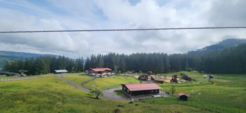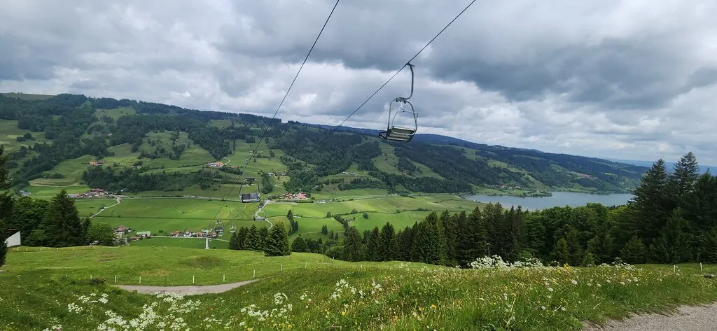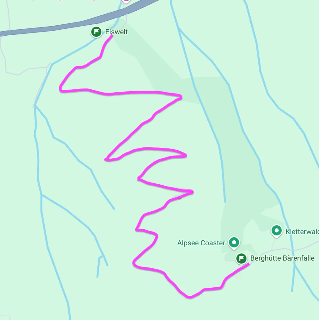 길은 좀 경사진 포장도로 또는 자잘한 자갈길이다. 지그재그로 난 산길을 50-60분 걷다 보면 리프트 도착/출발 지점, Alpsee 코스터 출발지점, 놀이터, 호텔, 음식점, 카페, 알파카 목장, 클라이밍 장소 등이 있는 목적지에 이른다.