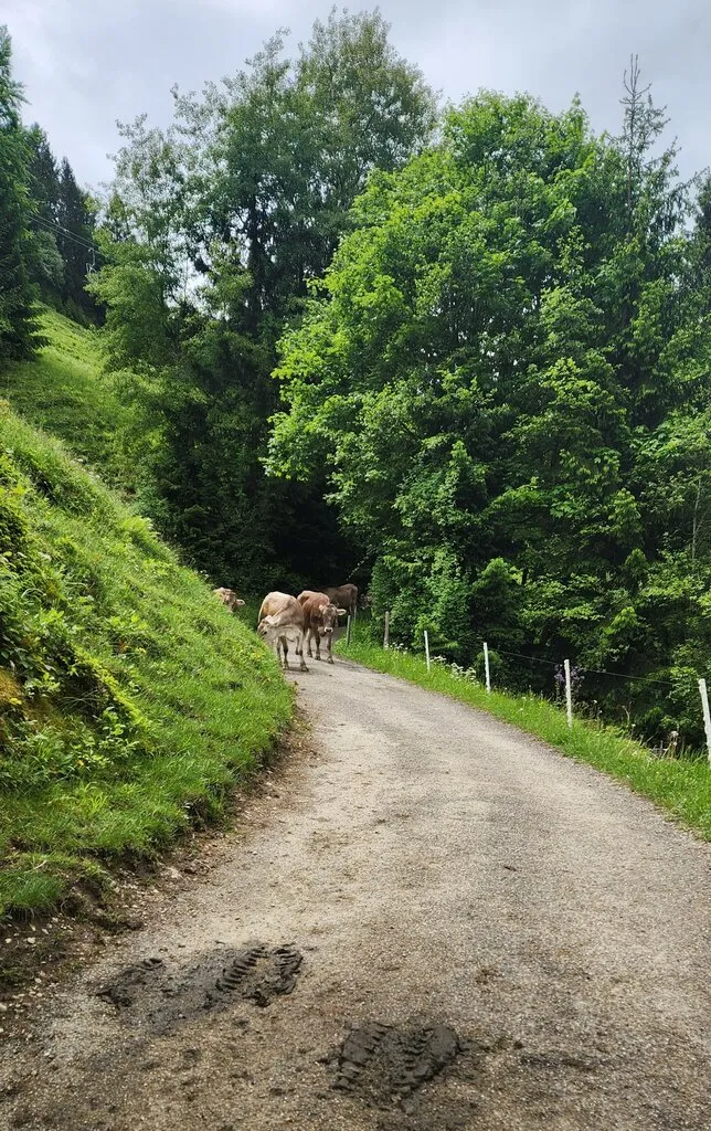 올라갈 때 울타리 너머에 있었던 소들을 등산로 한복판에서 마주쳤다. 반대편에서 올라가던 등산객들이 웅성웅성 조심조심 옆으로 지나가는 것을 보고 나도 소들의 눈치를 살피면서 조용히 지나갔다. 소들이 나를 크고 검은 눈으로 빠안…히… 쳐다봤다. 내가 지나가고 나자, 내가 가는 방향이 원래 소들이 가던 방향이었는지 내 쪽으로 천천히 걸어오기 시작했다. 빠른 걸음으로 산을 내려왔다.