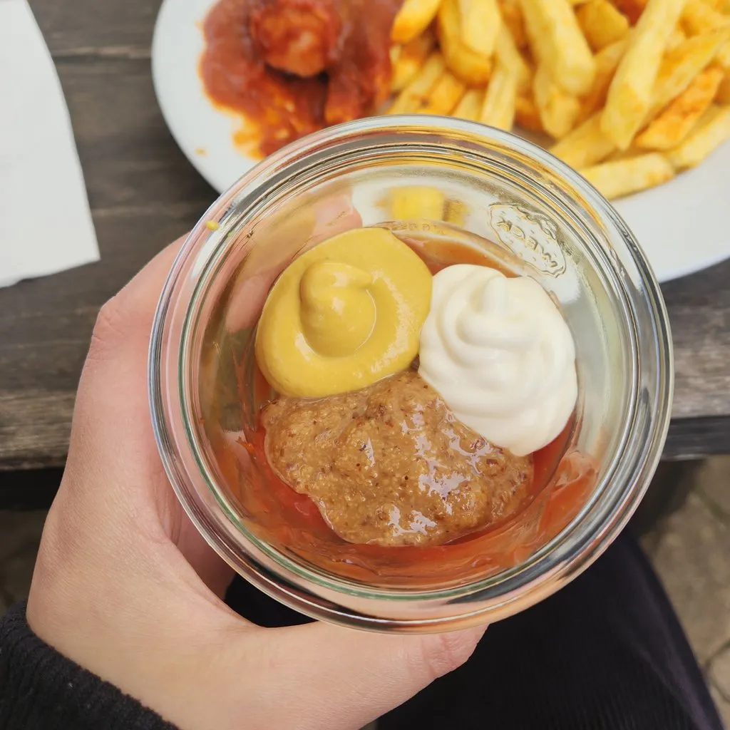 물을 타기 전에 마셔 봤는데, 맛은 술이고 향기는 초콜릿이었다. 대충 컵 크기에 맞추면 되겠지? 하고 컵을 꽉 채워서 물을 부어 버렸더니 완전 밍밍해졌다. 그래도 다 마셨다. 점원분이 커리부어스트를 가져오시고 소스 케찹, 마요네즈 중에 뭐할거냐 해서 케찹 했더니 작은 병에 케찹을 받아오셨다. 감튀에 찍어 싹싹 긁어 먹은 후 다른 소스도 종류별로 담아서 찍어먹었다.
