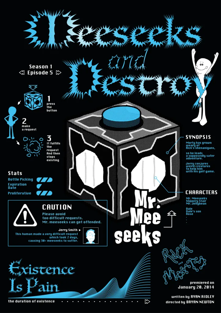 애니메이션 'Rick and Morty'의 한 에피소드 'Meeseeks and Destroy'와 캐릭터 'Mr.Meeseeks'에 대한 인포그래픽 포스터, 그리고 작중의 패밀리 레스토랑 'Shoneys'의 식사 할인 쿠폰을 제작했습니다.