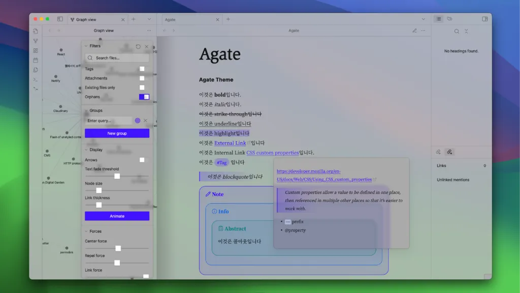 Obsidian의 CSS variable을 사용해 디자인을 편집하고, 마이크로 타이포그래피를 하고, 매크로 타이포그래피를 했다. 플러그인도 사용해 보았다.